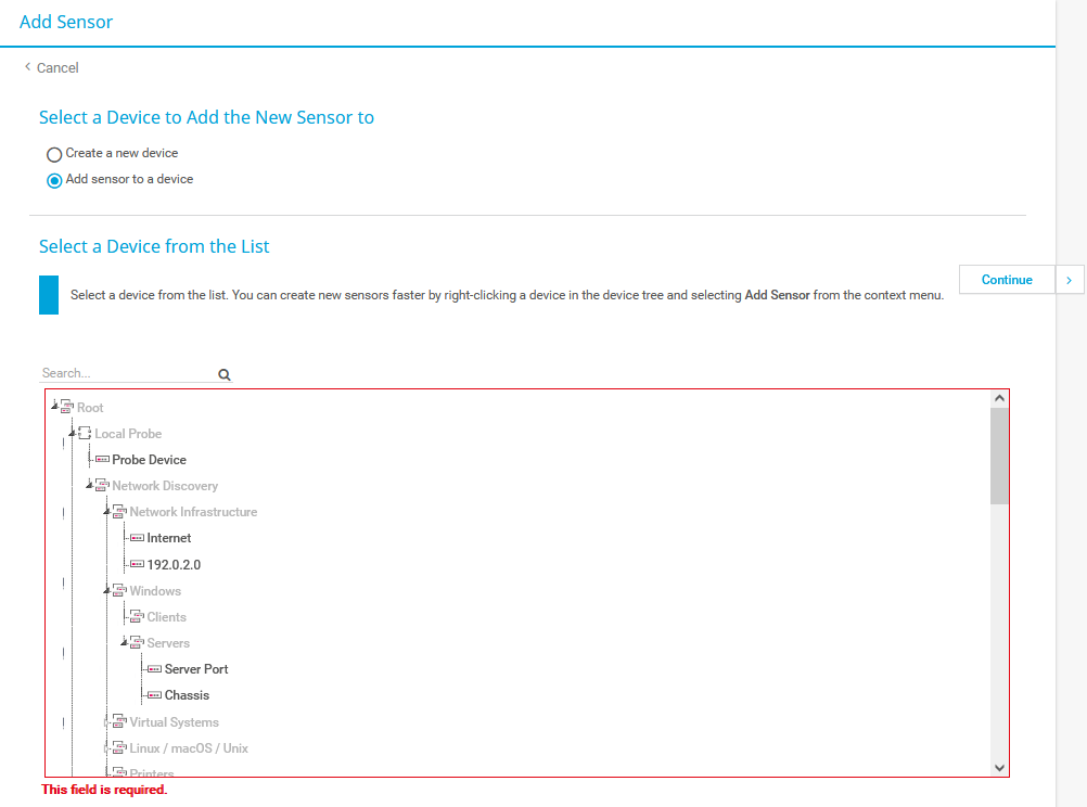 • Select Add Sensor from the context menu of a device to which you want to add the new sensor. This skips step 1 and leads you directly to step 2.