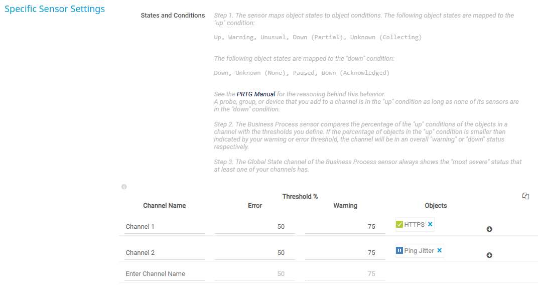 The Business Process sensor gives you a summarized status of entire business processes while monitoring several process components. This means that you can create a customized sensor with channels based on data from other sensors ("source sensors") that are specific to your network.