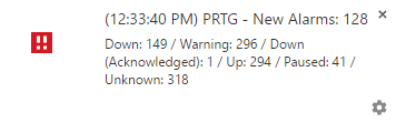 PRTG shows desktop notifications (by default, in the lower-right corner of your desktop) whenever there are new alarms after a page refresh in the PRTG web interface. The notification displays the number of new alarms and the current number of each sensor status.