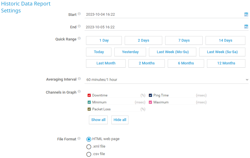 Select the channels that you want to include in the graph of the historic data report. You can select individual channels via the respective checkboxes, and show or hide all channels via the Show all or Hide all buttons. In the graph, PRTG then only shows the data of selected channels.