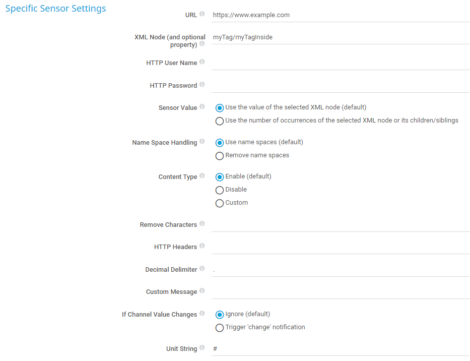If the sensor value of the returned XML node is of the type float, you can define any character as the decimal delimiter. Enter one character or leave the field empty.