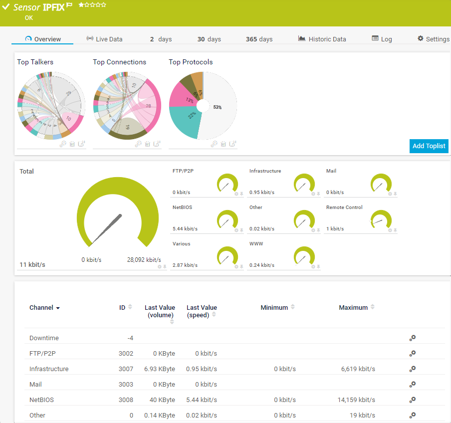 The IPFIX sensor receives traffic data from an Internet Protocol Flow Information Export (IPFIX) compatible device and shows traffic by type. This sensor has several filter options to divide traffic into different channels.