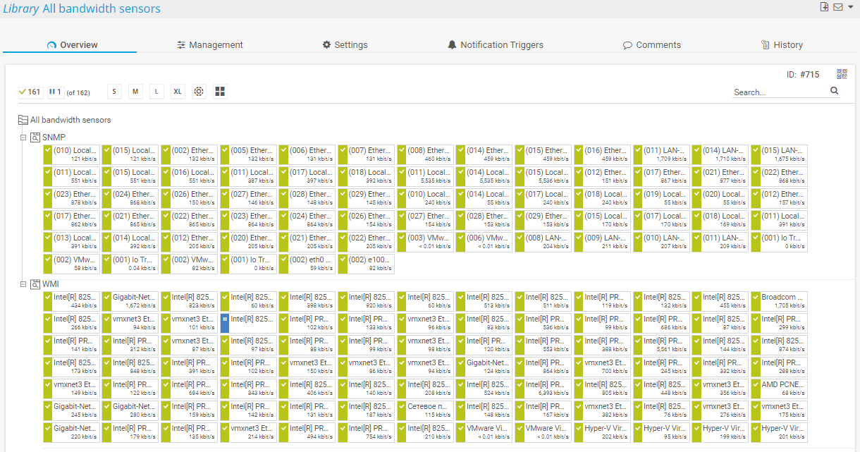 With libraries, you can create custom device tree views of your network's status and monitoring data. PRTG updates these views in the same interval as your device tree. The library views display the same monitoring data, but arranged the way you want, for example, based on target groups or a specific use case. For example, you can create a library that contains an overview of all your bandwidth monitoring sensors, regardless of the device that they run on.