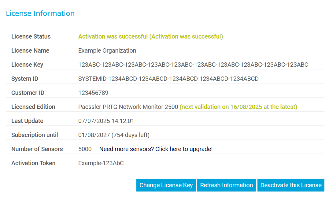 Shows the owner of the license that you use for this PRTG installation, for example ExampleOrganization.