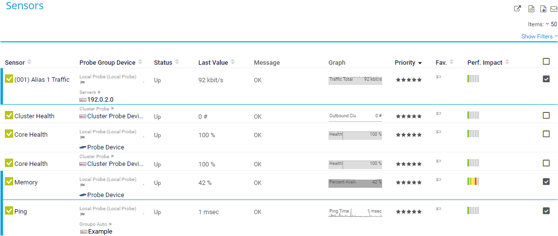 When you select one or more objects, the multi-edit menu appears in which different functions are available. The available menu options depend on the selected objects. For sensor lists, for example, some frequently used functions are Pause (b_multi_edit_pause), Resume (b_multi_edit_resume), Scan Now (b_multi_edit_scan), Delete (b_multi_edit_delete), or Settings (b_multi_edit_settings). Click a button to apply the respective function to all selected objects.