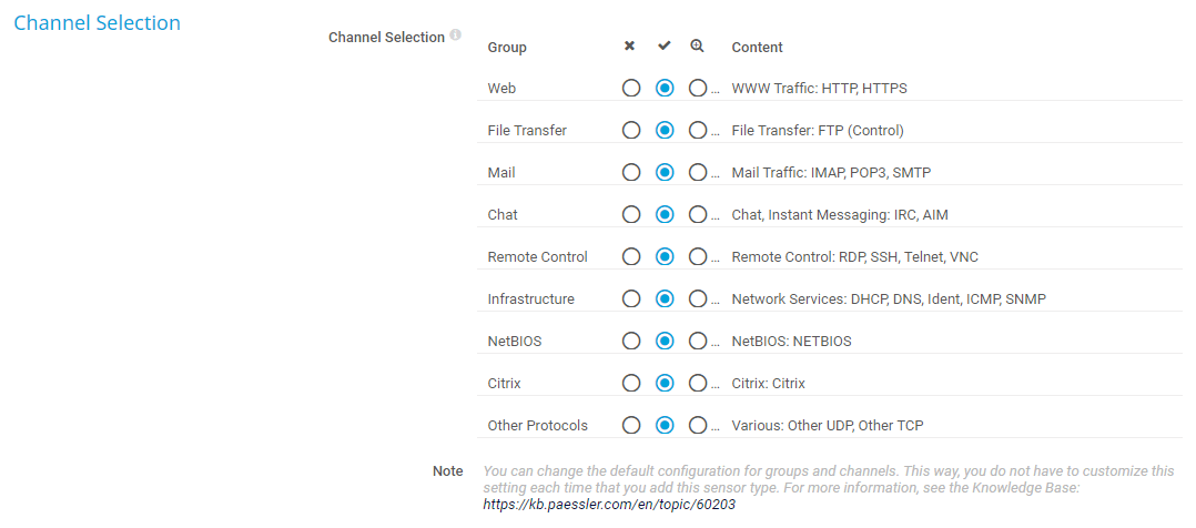 • No (i_channel_selection_no): Do not account traffic of this group in its own channel. The sensor accounts all traffic of this group to the default channel named Other.