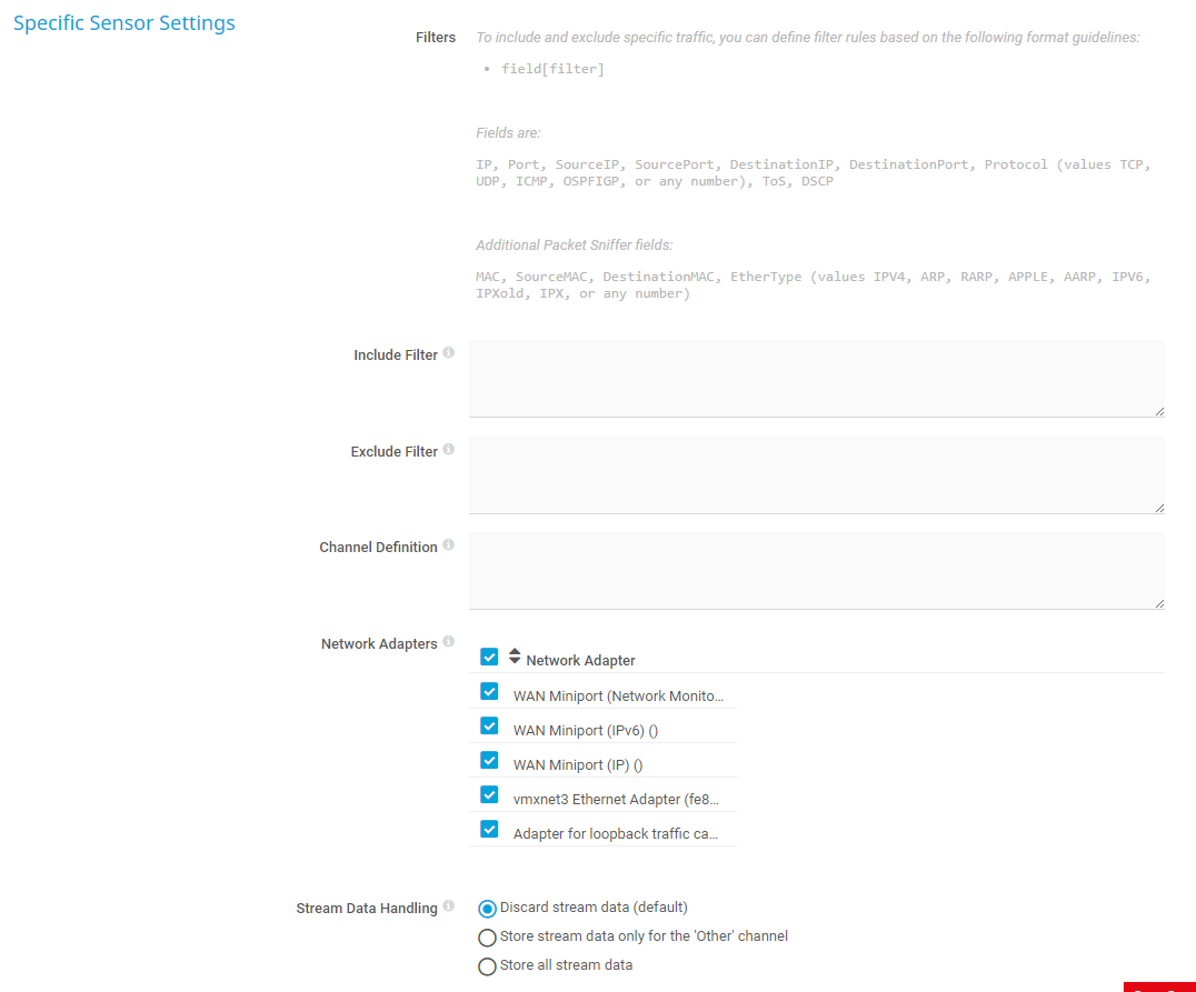 The Packet Sniffer (Custom) sensor monitors the headers of data packets that pass a local network adapter using a built-in packet sniffer. With this sensor, you can define your own channel definitions to divide traffic into different channels.