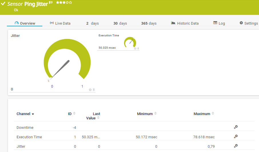 In the channel table on the Overview tab, this channel never shows any values. PRTG uses this channel in graphs and reports to show the amount of time in which the sensor was in the Down status.