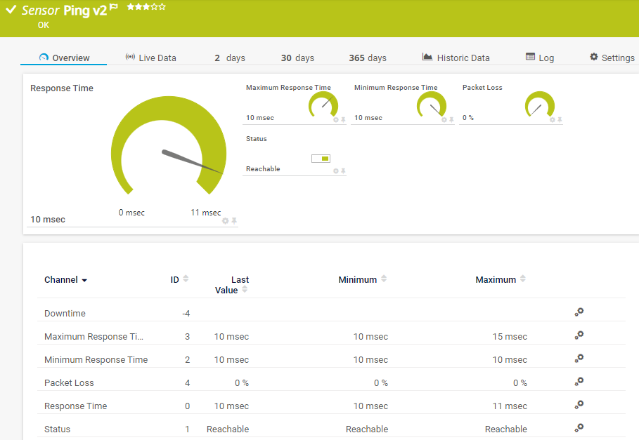 • Send multiple ping requests (default): Send multiple pings in a row. The sensor then also shows the minimum and the maximum ping time as well as the packet loss (in percent).
