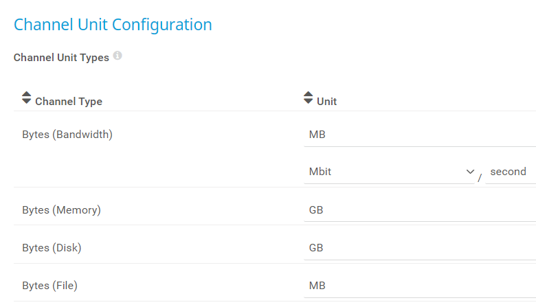 For each type of channel, select the unit in which PRTG displays the data. If you define this setting on probe, group, or device level, you can inherit these settings to all sensors underneath. You can set units for the following channel types (if available):