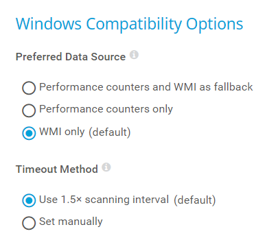 Compatibility mode (deprecated): Use this only if the default connection mode does not work on the target system. The compatibility mode is the connection mode that PRTG used in previous versions and it is deprecated.