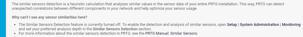i_round_bluePRTG does not show the Similar Sensors section when the analysis is disabled or when you exceed 1,000 sensors and select the Manage automatically based on sensor count (default) option as Analysis Depth in the Monitoring settings. In this case, you see the following notice: