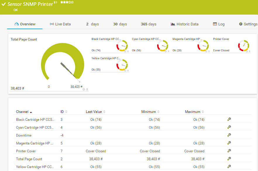 The SNMP Printer sensor monitors various types of printers via the Simple Network Management Protocol (SNMP).