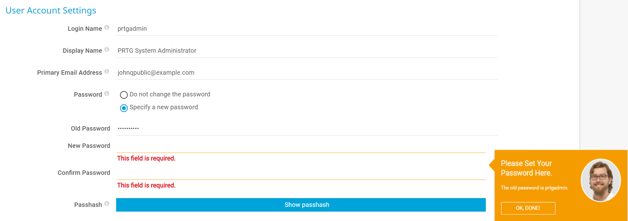 Back in the device tree, the setup assistant in PRTG Network Monitor asks you to change your password. Click OK, Show Me! and follow the assistant to your account settings. By default, PRTG uses the PRTG System Administrator user account with the login name prtgadmin and the password prtgadmin. So we strongly recommend that you change the password to protect PRTG from unauthorized access.