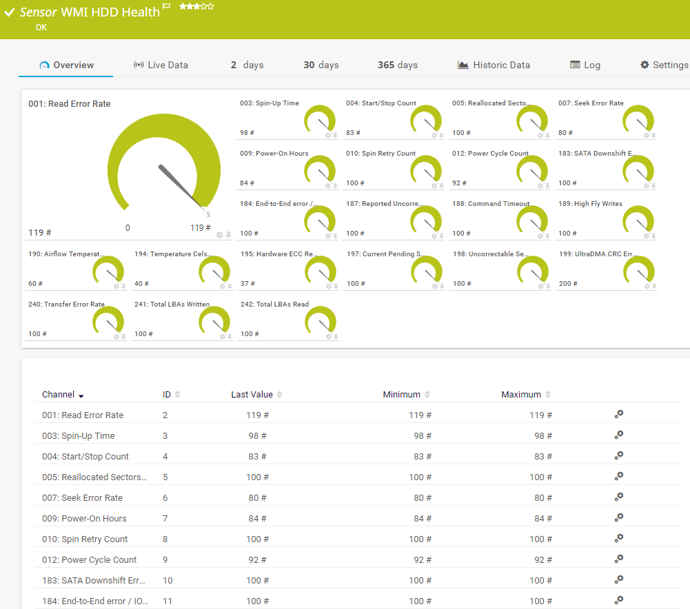 Every attribute of a disk assumes a value. PRTG shows these attributes as channels with their last, minimum, and maximum value. These channel values change over time and indicate the disk health. Higher values correspond to a better health. The disk's attributes come with a threshold, defined by the manufacturer of the drive. If a channel value is lower than this threshold, the sensor automatically shows the Warning status. This indicates that the S.M.A.R.T. status of the HDD might break soon.