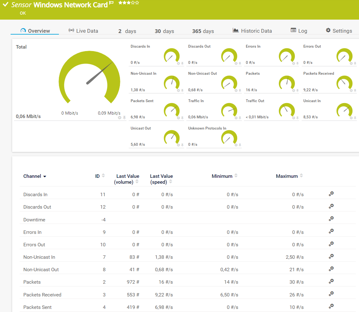 i_round_blueThis sensor requires as of at least Windows Server 2008 R2 or Windows 7 to monitor 64-bit counters of the class Network Adapter (virtual network interfaces). On older target systems, the sensor can only monitor 32-bit counters of the class Network Interface (the physical interface) and shows fewer channels.